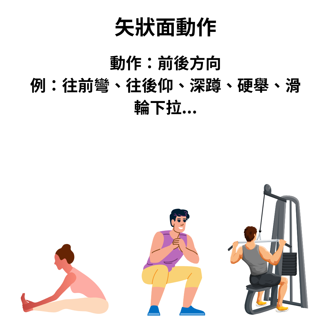 所有「前後方向」的動作都發生在這個平面上,例如:深蹲、彎腰點頭、睡覺、耍廢躺在沙發上、長時間坐著辦公