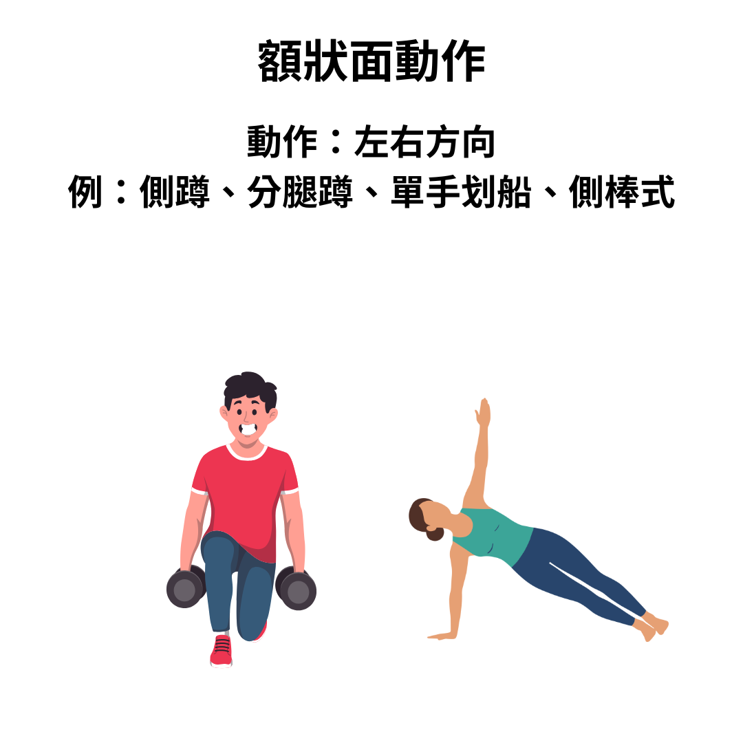 所有「左右方向」的動作都在這個平面上,例如:側彎、單腳站立時的平衡